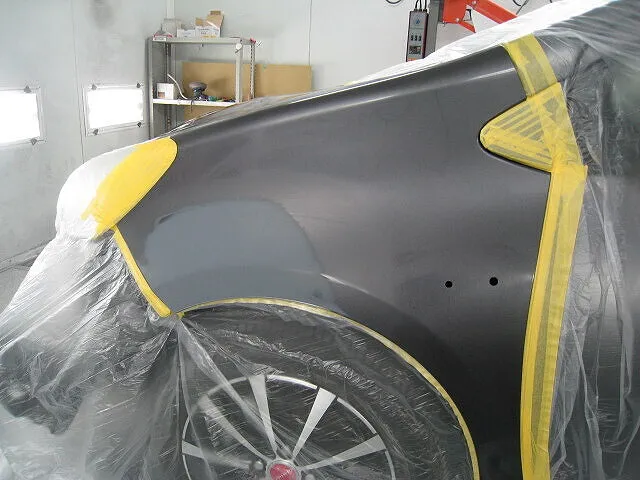 塗装前はしっかりとマスキング作業をします。しっかりマスキングしないと、他のパネルにも色が着いてしまうんです。パテで形成した部分にはサフェ-サ-が塗られています。