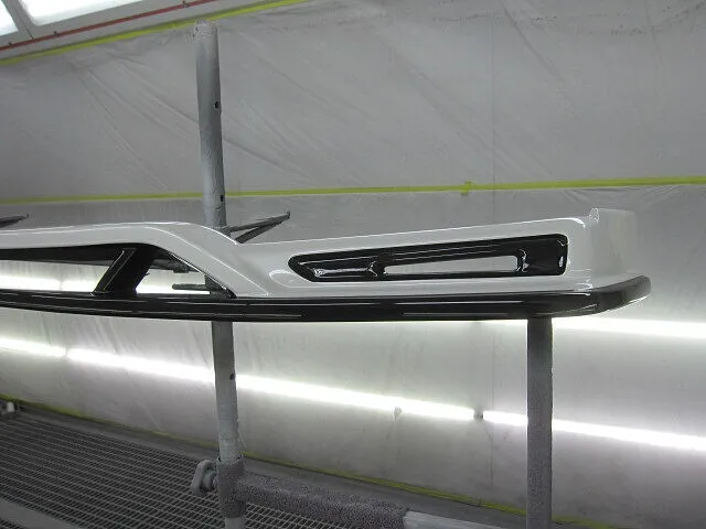 下地が乾いたら塗装していきます。フロントリップスポイラーがブラックと3コートパールのツートンカラーなので、まずは全体にブラックを塗装します。乾燥後マスキングを行ない3コートパールを塗装します。同時にフロントバンパーも塗装します。ボディカラーに合わせて調色した塗料を薄く何度も重ねてボディカラーに近づけていきます。パール塗装が終われば、クリア塗装をして作業完了です。