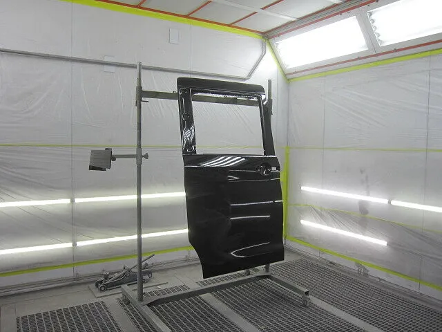 新品パネルのリアドアパネルを車体カラーに合わせて塗装をします。続けてフロントドア・クォーターパネルも塗装します。カラーはシルバー系のガンメタリック色なので、まずはベースカラーを薄く何度も重ねて、続けてトップコートの役割を果たすクリア塗装をして塗装作業完了です。