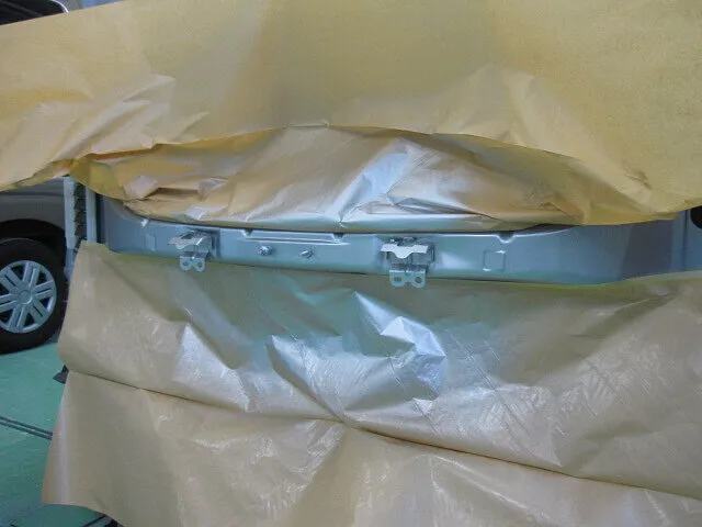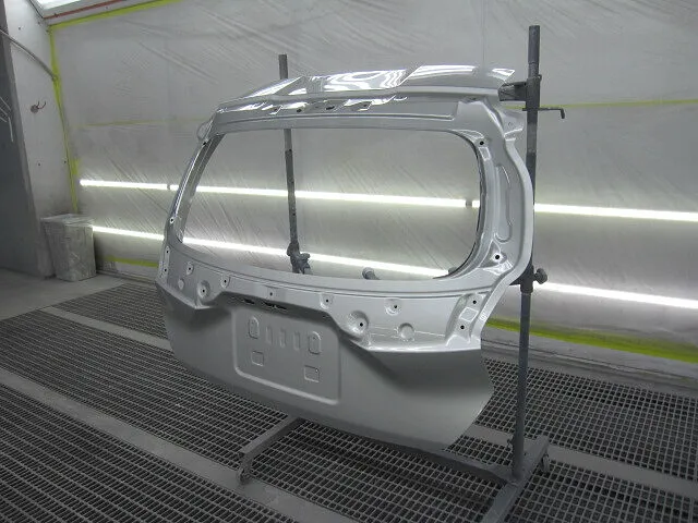新品パネルのリアゲートパネルを車体カラーに合わせて塗装をします。カラーはシルバーのメタリック色なので、まずはベースカラーを薄く何度も重ねて、続けてトップコートの役割を果たすクリア塗装をして塗装作業完了です。