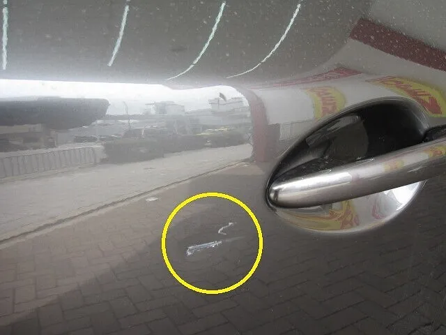 家の近くで車修理が安いお店を探されていたときに、当社HPを見つけてお問合せいただきました。ありがとうございます。早速フロントドアのヘコミの状態を確認しましす。フロントドアのアウターハンドルの横にえぐれたヘコミがあり、一部塗装も剥がれ鉄板が見えています。