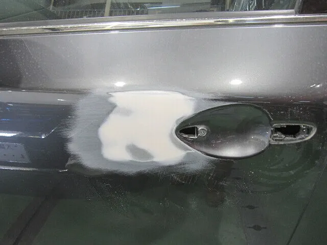 まずは、ドアハンドルを外して、ヘコミ周辺の塗装膜を剥離し、ヘコミ部分をスタッド溶接機を用いて引き出し鈑金しています。引き出し鈑金の後、まわりの塗装膜を取り除きパテが付きやすい状態にしています。最初は少し粗い目のパテで形成し始めます。その後、徐々に目の細かいパテに変えていき、形成。最終パテを研ぎ終え形成したら、いよいよ脱脂して塗装の準備です。下地処理剤のサフェーサーを塗布して、塗料の食いつきを良くするための足付けを行います。ここまでの下地処理は、塗装の仕上がり品質の80%を決めると言っても過言ではない程に重要な作業なんです。