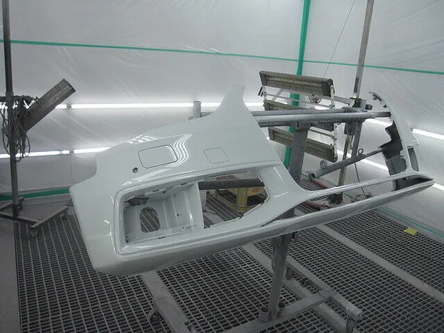 当店は、チリやホコリを遮断できる専用のプッシュプル式塗装ブースにて作業を行なうため、高クオリティーの塗装を実現いたします。そのため異物が混入する心配はほとんどありません。塗装後もしっかりと焼付け、乾燥させてからフロントバンパーを取り付けて専用ポリッシャーで磨き上げて完成です。