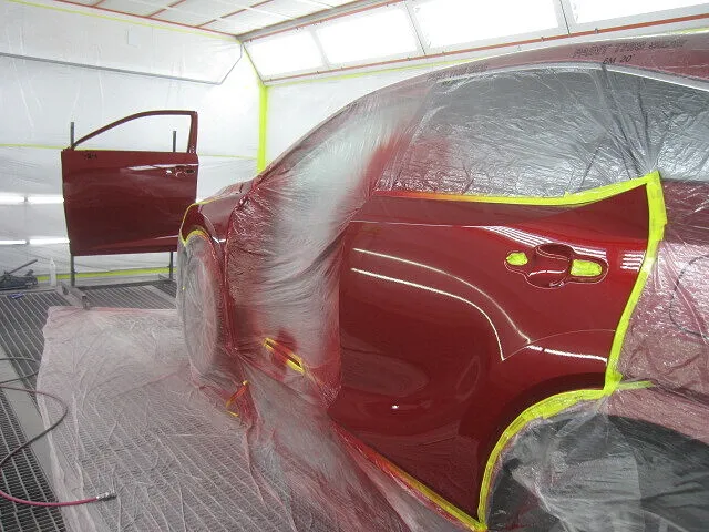 下地処理剤のサフェーサーが乾燥したら、続いて塗装作業に入ります。色を合わせのため、前後のパネルのフロントフェンダー・リアドアパネルも同時に塗装して行きます。カラーはワイン色3コートパール色なので、まずはワイン色のベースカラーを薄く何度も重ねて、続けてパール色を塗装しボディの色に近づけます。パール塗装を終えたら、最後にトップコートの役割を果たすクリア塗装をして塗装作業完了です。