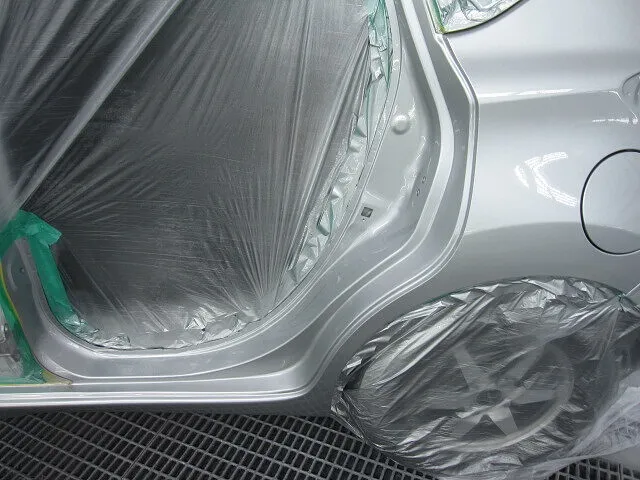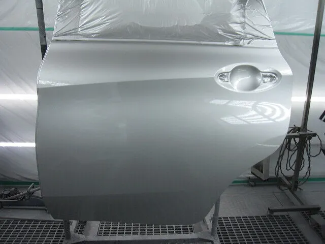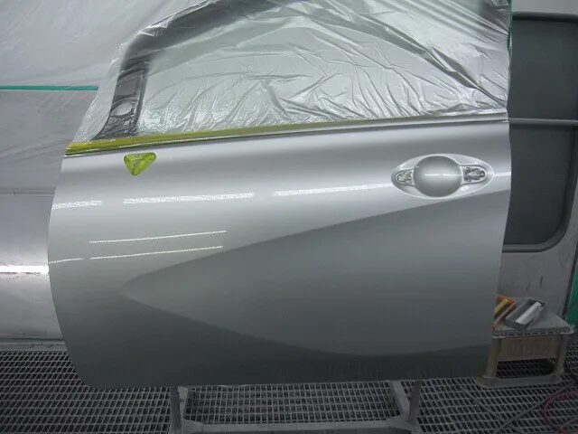 下地処理を終えたらクォーターパネルを車体カラーに合わせて塗装をします。次にリアドア及び色合わせのためにフロントドアも同時に塗装します。カラーはメタリック系のシルバーカラーなので、まずはベースカラーを薄く何度も重ねて、続けてトップコートの役割を果たすクリア塗装をして塗装作業完了です。