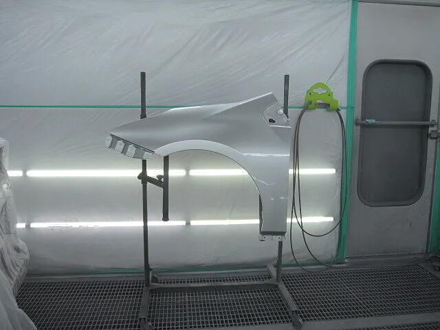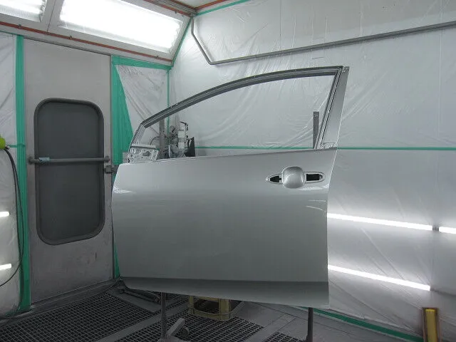 新品パネルのフロントフェンダー・フロントドアを塗装、続いてリアドア・クォーターパネルも車体カラーに合わせて塗装をします。カラーはシルバー色なので、まずはベースカラーを薄く何度も重ねて、続けてトップコートの役割を果たすクリア塗装をして塗装作業完了です。