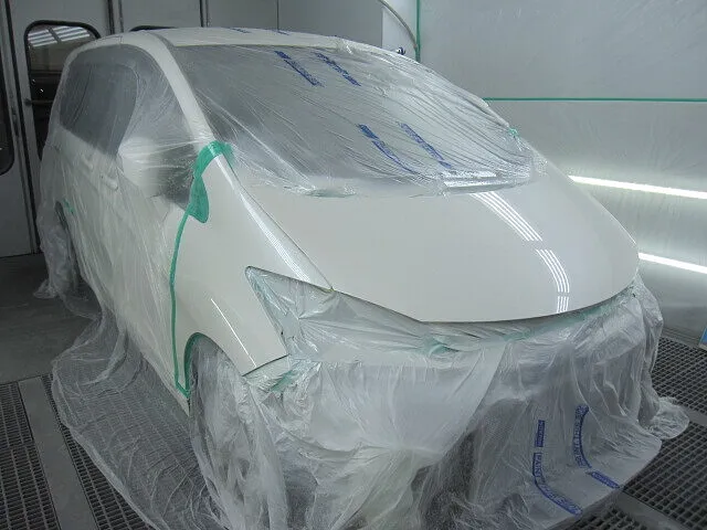 ボンネット・フロントバンパーを車体カラーに合わせて塗装をします。色合わせのため同時に左右フロントフェンダーも塗装します。カラーは3コートパール色なので、まずはベースカラーを薄く何度も重ねて、続けてパール色を塗装しボディの色に近づけます。パール塗装を終えたら、最後にトップコートの役割を果たすクリア塗装をして塗装作業完了です。