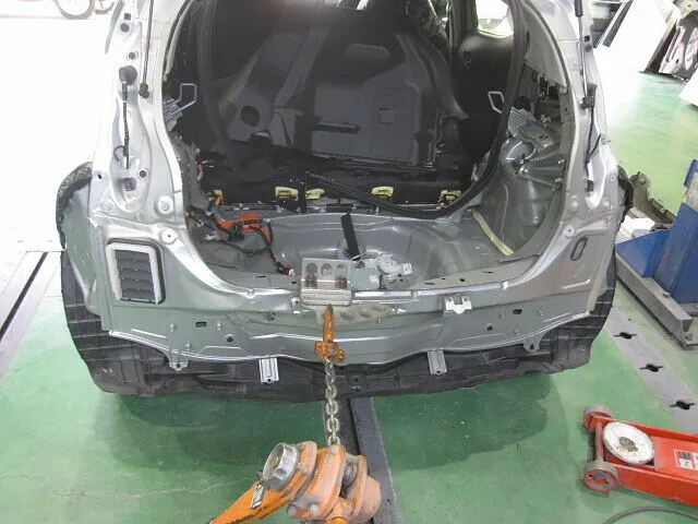 まずはリアゲートパネルとリアバンパーを取り外し、損傷したバックパネルを修正機で元の位置まで正確に引き出します。その後、スポットカッターでバックパネルを切り離し、溶接機を使用して新品バックパネルを確実に取付けます。新品パネルのリアゲートを仮付けし、隙間やチリを細かくチェックして鈑金工程は完了です。