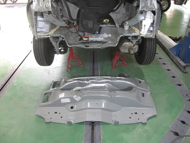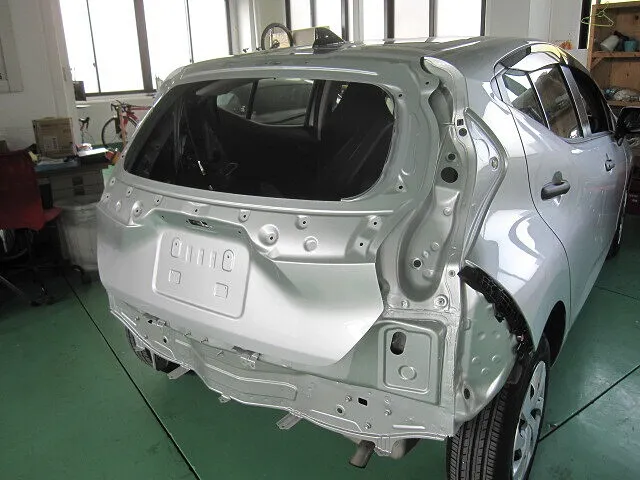 今回のトヨタ アクアの追突事故修理では、リアゲートパネル・リアバンパーの新品交換に加え、バックパネルを新品パーツへ交換する鈑金塗装(キズ・ヘコミ修理)を実施しました。