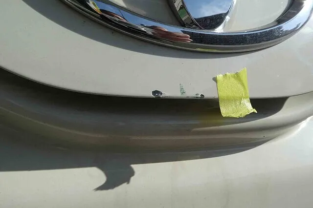 「うっかりして前の乗車に追突してしまった」とのことで、フロントバンパー中央部とボンネットにかけてヘコミを伴う傷があります。「できるだけ 安く 早く キレイに仕上げてほしい」とのご要望ですので、フロントバンパー・ボンネットを鈑金塗装(キズ・ヘコミ修理)で直していきます。