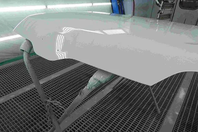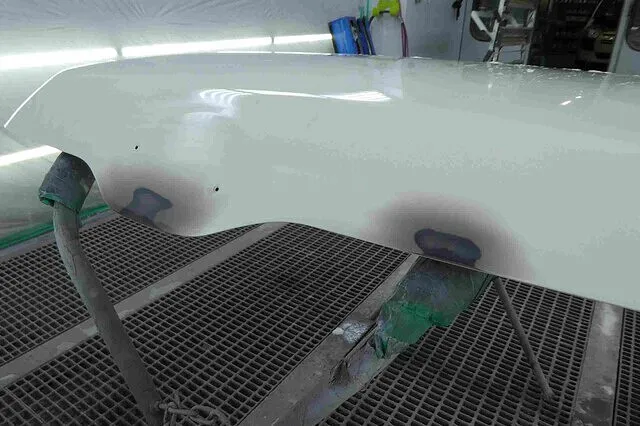 当店は、チリやホコリを遮断できる専用のプッシュプル式塗装ブースにて作業を行なうため、高クオリティーの塗装を実現いたします。そのため異物が混入する心配はほとんどありません。塗装後もしっかりと焼付け、乾燥させてから専用ポリッシャーで磨き上げ、最後に別に塗装したフロントバンパーを組み付けて完成です。