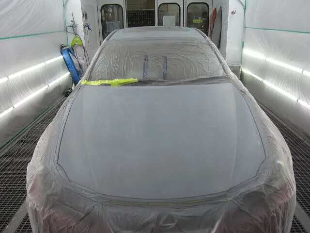鈑金作業を終えたら塗装作業へ。はじめにサーフェーサーという下地処理剤を塗布。サーフェーサーは塗料の食いつきを良くする塗装時の必須アイテムです。下地が乾いたら、カラー塗装からのクリア塗装で作業完了になります。