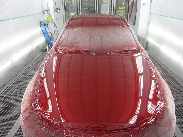 下地処理剤のサフェーサーが乾燥したら、続いて塗装作業に入ります。カラーはワイン色の3コートパール色なので、まずはベースカラーを薄く何度も重ねて、続けてパール色を塗装しボディの色に近づけます。パール塗装を終えたら、最後にトップコートの役割を果たすクリア塗装をして塗装作業完了です。