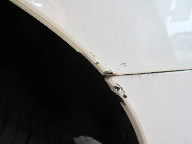 まずキズ周りの塗装膜を剥離し、凹み、変形部分をスタッド溶接機を用いて引き出し鈑金しています。引き出し鈑金の後、今度はパテにて形成していきます。
